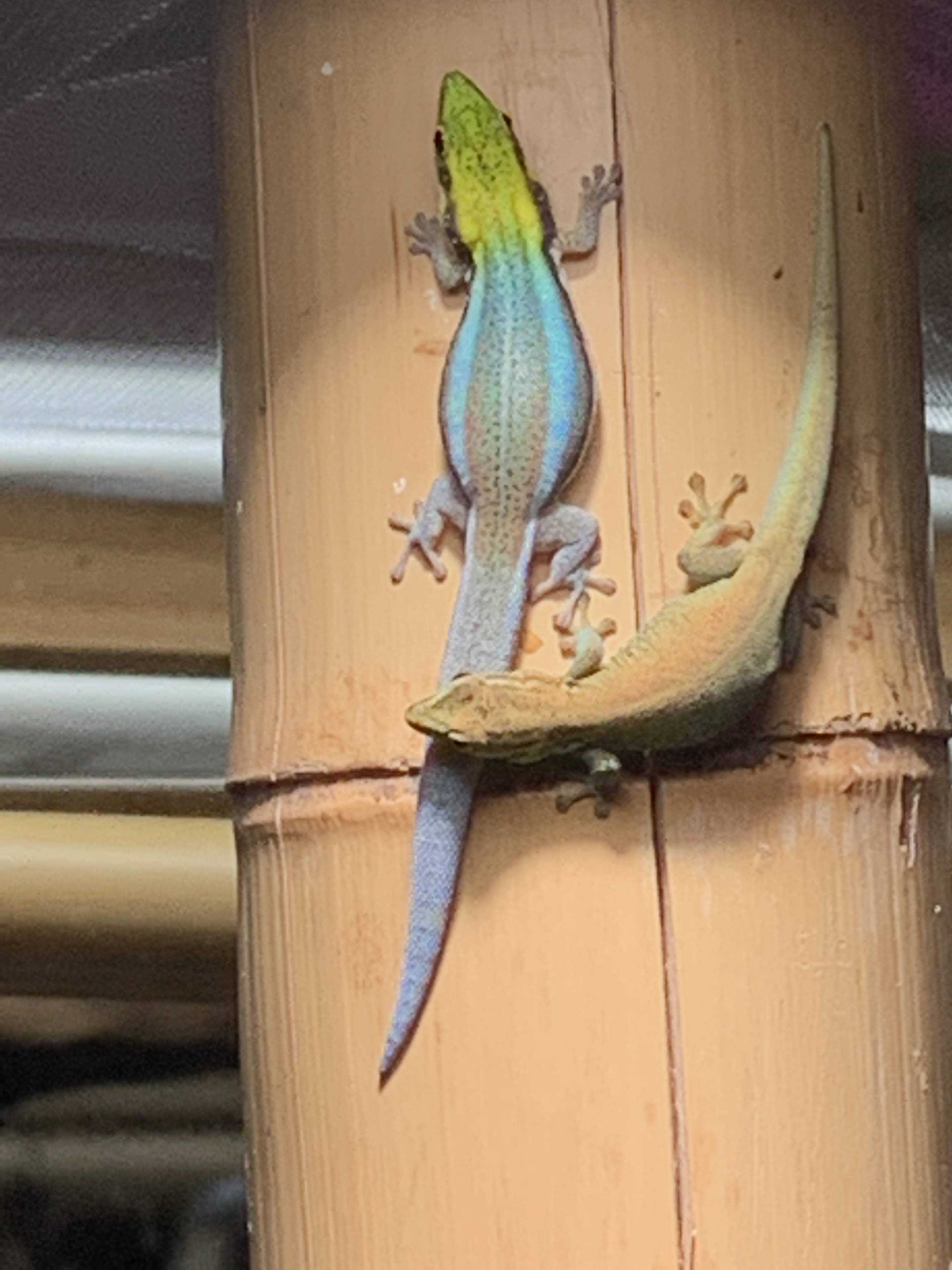 Die Weibchen legen während der Legeperiode rund alle Monate ein Doppelei, seltener ein Einzelei. Sie kleben die Eier gerne an glatte Flächen, so auch an die Terrarienscheibe. Ich stecke ein Reagenzglas in ein Rohr (Bambus) in welchem die Tiere gerne die Eier ankleben, die Überführung in den Inkubator perfekt möglich. Bei 24 Grad schlüpfen mehrheitlich die gewünschten Weibchen. Die Aufzucht anfangs in Gruppen, schon bald aber geben sich die Racker auf den "Deckel" und es empfiehlt sich die weitere Aufzucht in separaten Behältern. LED Beleuchtung und neu statt T5 Röhren sind kleine UV-LED Spots. Ich verkaufe meine Tiere erst, wenn sie gut jährig sind, vorher sollte die Paare nicht zusammengesetzt werden. Für die Regeneration der Weibchen empfiehlt sich unbedingt eine kühlere Haltung im Winter, damit keine Eier mehr gelegt werden. Die Beleuchtungszeit kann ebenfalls reduziert werden. Die Aufzucht der Jungen ist problemlos, allerdings hatte ich früher Verluste mit dem Verfüttern von Drosophila. Hauptfutter sind bei mir die Mikroheimchen. Achtung: Nicht die oft für Mikroheimchen verkauften Kurzflügelgrillen. Mit ihren langen Fühlern bemerken sie die tapsigen Angriffe der Jungen früh und entkommen, was bei Heimchen klar weniger der Fall ist.